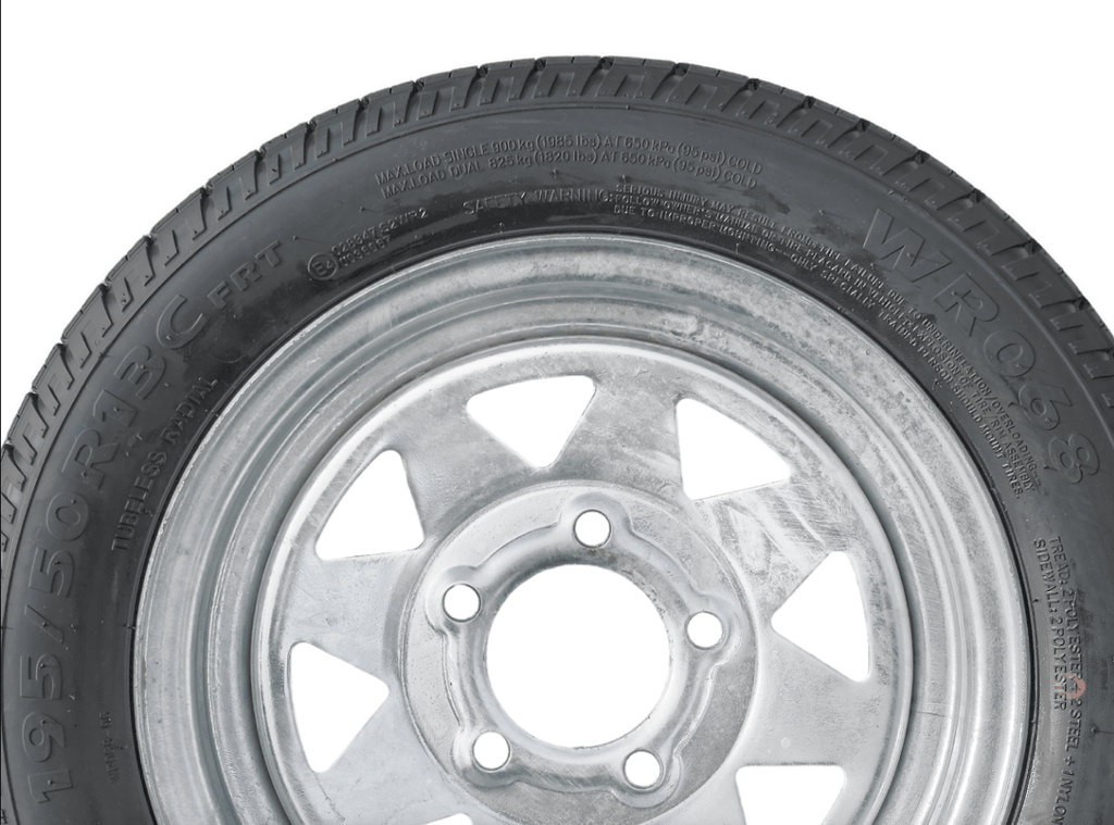 Centre: 5 x 4 1/2”, Tyre: 195 x 13” x 8 ply, 900kg tyre , Galvanised Rim