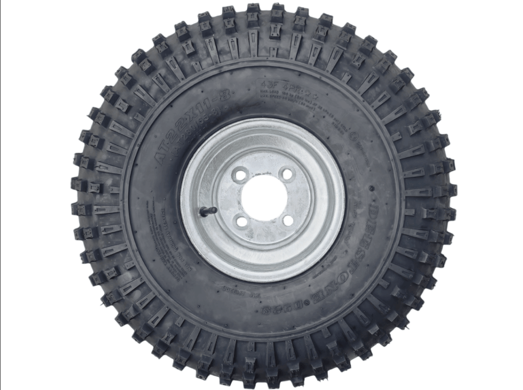 Centre: 4 x 4”, Tyre: 22/11 x 8” pneumatic knobbly tyre , Galvanised Rim