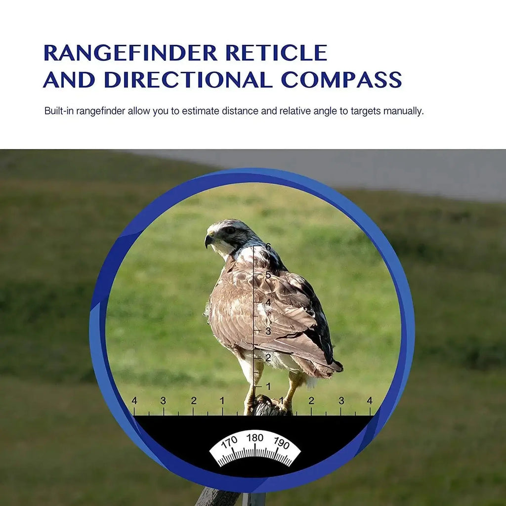 4)Rangefinder scale and internal directional compass with lighting switch indicate the distance or size of the object being viewed and its orientation.