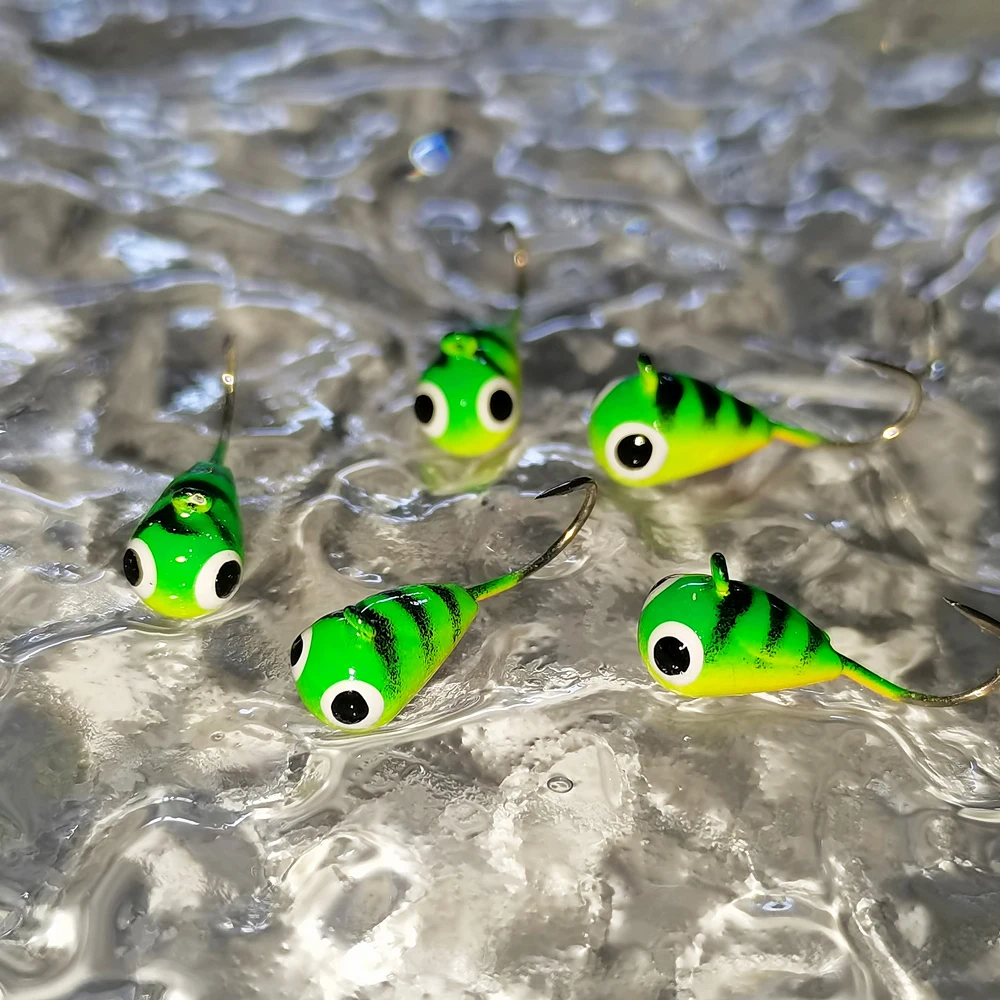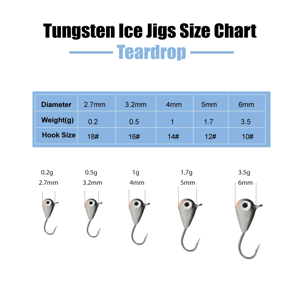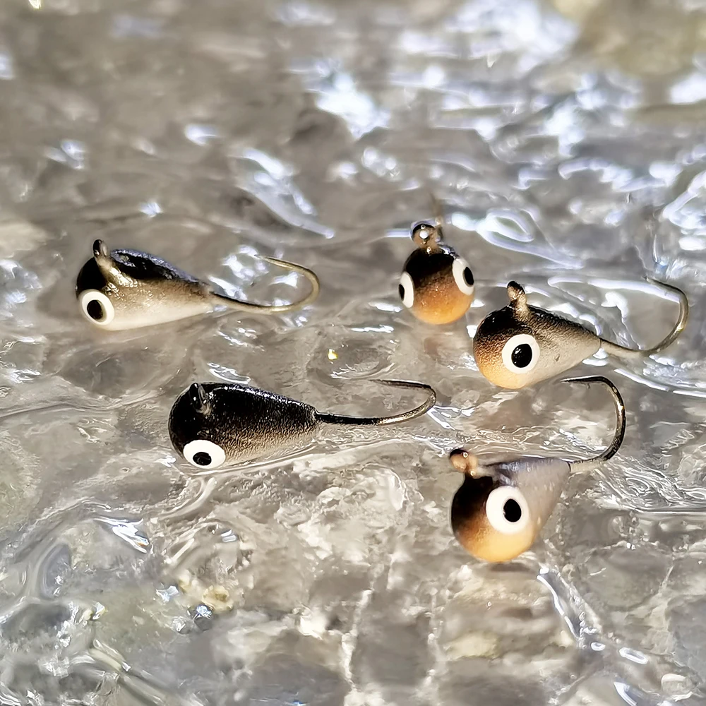 Great winter jig, cold water jig. Tip this with a wax worm or spike and you are set to catch fish. Thin strips of plastic lure can also be used on these lightweight jigs that flutter. The teardrop jigs are for smaller baits - bluegill, perch, crappie, trout and many other species.