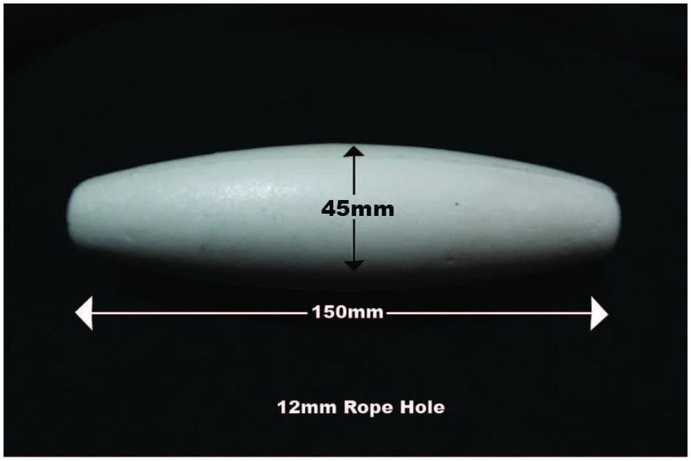 The F150 EVA Whisper Net Float is ideal for inshore fishing applications, including mullet nets, kahawai nets, and general net buoyancy setups. The 12 mm rope hole fits standard rope sizes, allowing for quick and secure attachment to your nets.