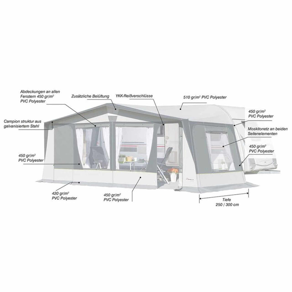 Easy to use and extremely durable, this awning represents fantastic value for money. The front wall comprises two panels with two/four fixed transparent windows and a door on each side, allowing all possibilities of variation. Each side panel features a door and a window, with the right-hand side panel hosting a mosquito net. The whole awning may be transformed into a veranda or into a sun canopy.