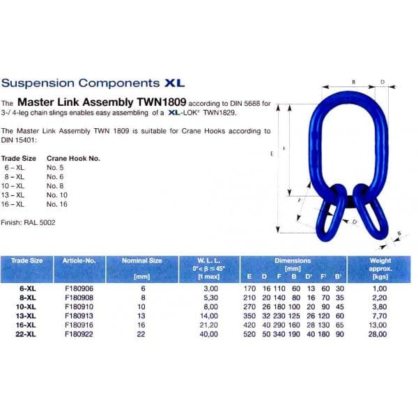 • Size/Rating; 22mm 3-4 Leg 40.0T at 90Deg