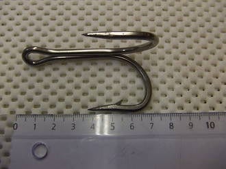Mustad 7982HS double barbed O'Shaughnessy hook - forged, ringed, not brazed, extra long, 0 degree angle, slightly wriggled point.
