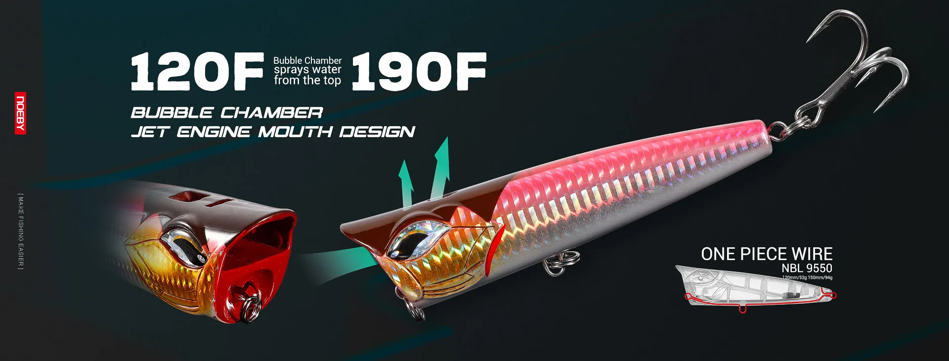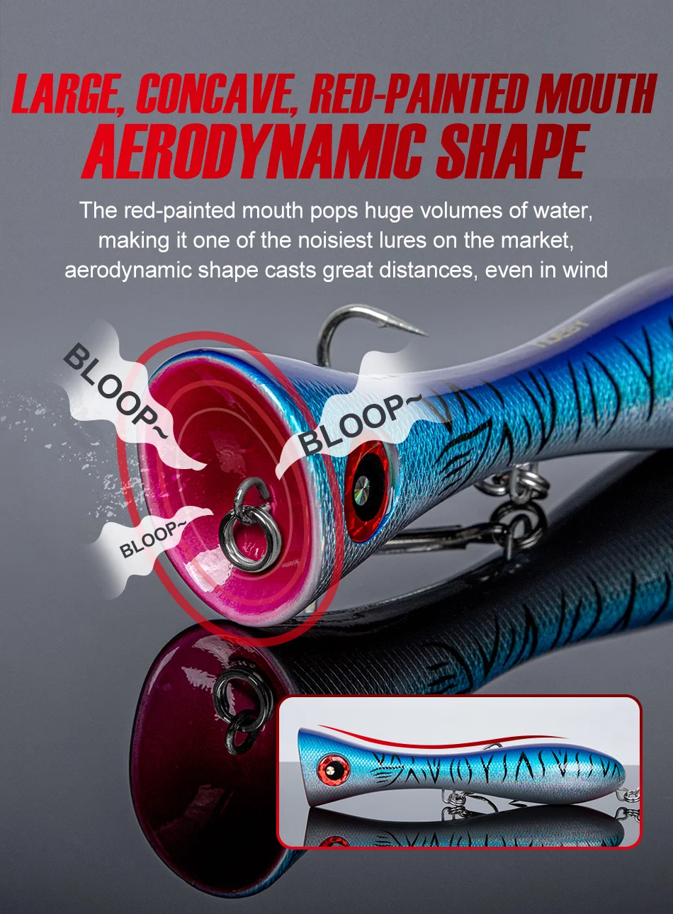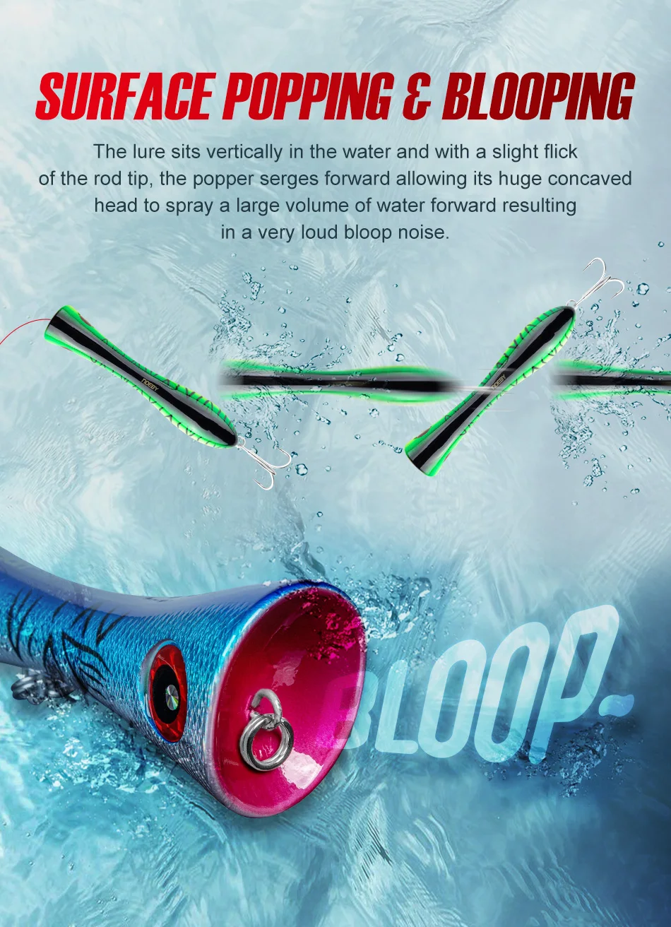 The lure sits vertically in the water and with a slight flick of the rod tip, the popper serges forward allowing its huge concaved head to spray a large volume of water forward resulting in a very loud bloop noise.