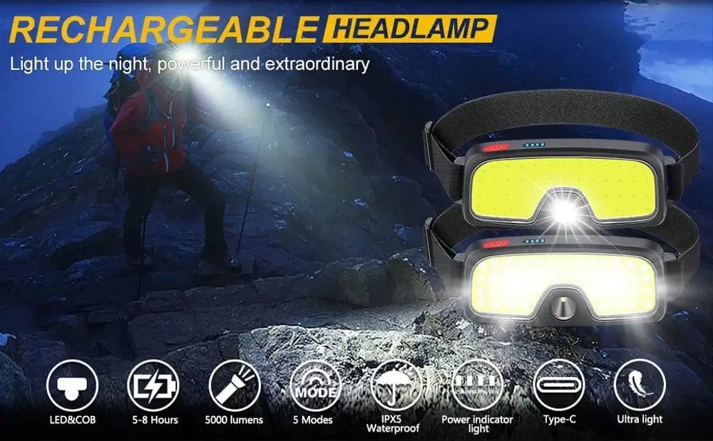 * Unmatched Brightness and Versatility:The Super Bright Headlamp Flashlight is a game-changer in the world of outdoor lighting. With its cutting-edge COB technology, this headlamp offers a wide beam that illuminates your surroundings with unparalleled brightness. Whether you're running, fishing, or camping, the headlamp's three modes (high, low, and flash) ensure you have the perfect lighting for any situation. The lightweight design, ensures comfort during extended use, making it an ideal companion for all your outdoor adventures.