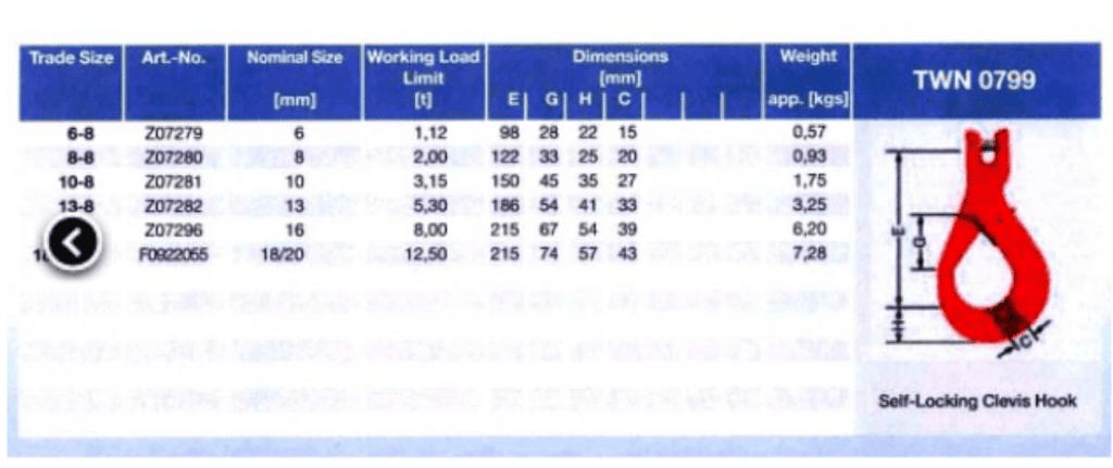 Safety Hook - Thiele TWN 0799 GK8 Clevis - 8mm 2.0T - International Standards EN1677 Self Locking Trigger Product No. F0922055