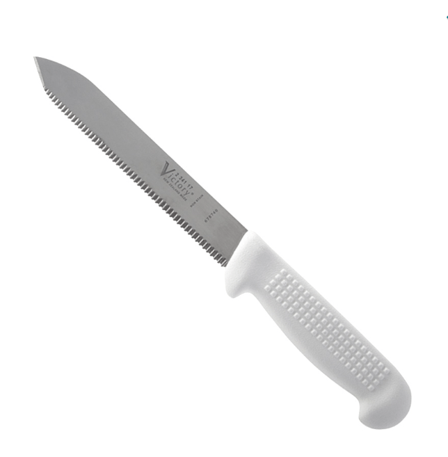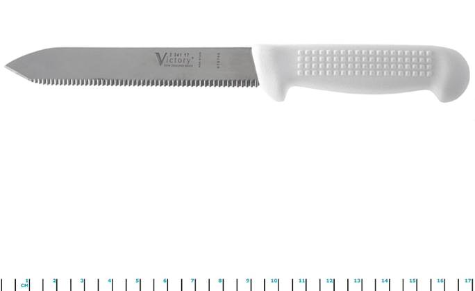 The Victory 341 Serrated Knife features a 17cm serrated blade made of high-quality stainless steel. It comes with a 115 white handle.