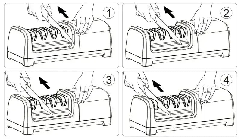 Place the knife into each of the left and right single-stage sharpening grooves, then pull the knife along the sharpening grooves from the heel to the tip of the knife.