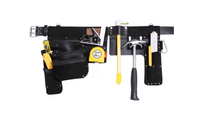 This tool belt has been designed so the pockets sit on the hips and is buckled up at the front, enabling freedom of movement in the legs. Pouches designed to sit on hips for freedom of leg movement in right or left hand options; Made from full grain leather for durability and comfort 3 large pockets nail bar, tape clip/combination square holder hammer loop, nail gun loop, one carabiner and lined chisel pouch 50mm heavy duty leather work belt; Belt buckles up at the front Designed with rolled edges, multiple rivets, no bottom seams for strength and ease of access Pockets slide on belt to enable optimum positioning of pockets Dees applied for Taurus braces (344AB/REV optional extra)s Designed and manufactured by Taurus Leather Company