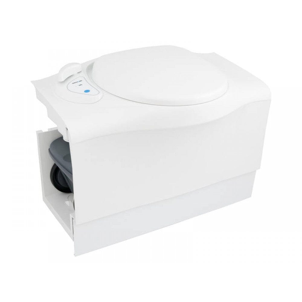 A Thetford cassette toilet is constructed of high-quality plastic and consists of two sections, a permanently installed toilet system and a slide-out waste holding tank located within the toilet.