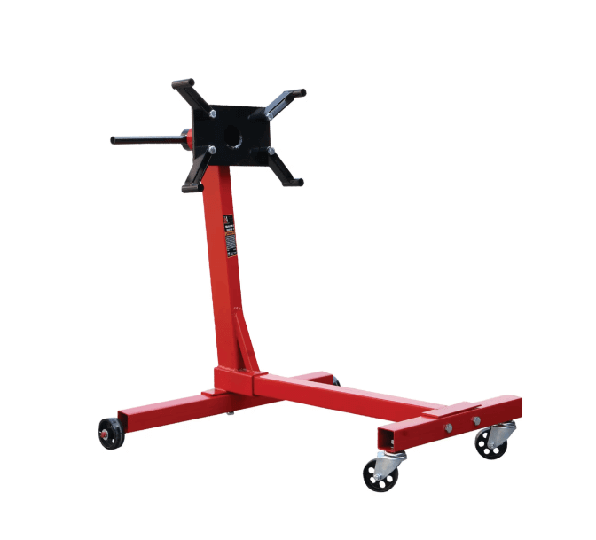 Rotating engine stand is constructed with heavy-duty steel providing long term durability. An extra-wide base provides maximum stability. Mounted on 4 heavy duty castors for extra manoeuvrability