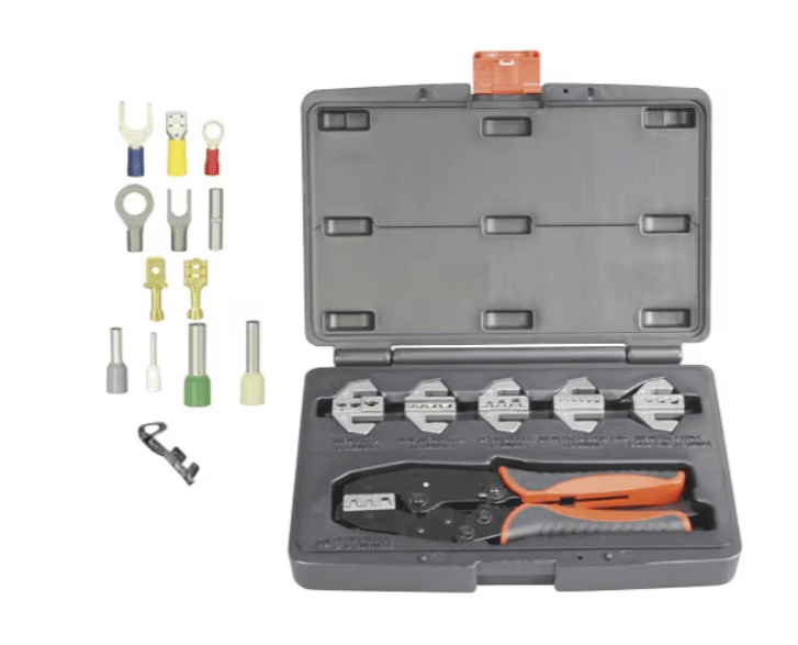 1 - 225mm crimper, 1 - Die (A) for Insulated Terminal, AWG 22-18, 16-14, 12-10 (DIN 0.5-1.0mm, 1.5-2.5mm, 4-6mm2), 1 - Die (B) for Non-Insulated Terminal, AWG 20-18, 16-14, 12-10, 8 (DIN 1.5, 2.5, 6, 10mm2), 1 - Die (C) for Open Barrel Terminal, AWG 20-18, 16-14, 12-10 (DIN 0.5-1.0mm, 1.5-2.5mm, 4-6mm2), 1 - Die (D) for Insulated Cord-End Terminal (Small AWG), AWG 22, 20, 18, 16, 14, 12 (DIN 0.5, 0.75, 1.0, 1.5, 2.5, 4mm2), 1 - Die (E) for Coax BNC Connector, RG58, 59, 62, 6 / 6.48, 5.41, 2.54, 1.72mm /0.255", 0.213", 0.1", 0.068", 0.324", 1 - Die (F) for Insulated Cord-End Terminal (Large AWG), AWG 10, 8, 6 (DIN 6, 10, 16mm2)