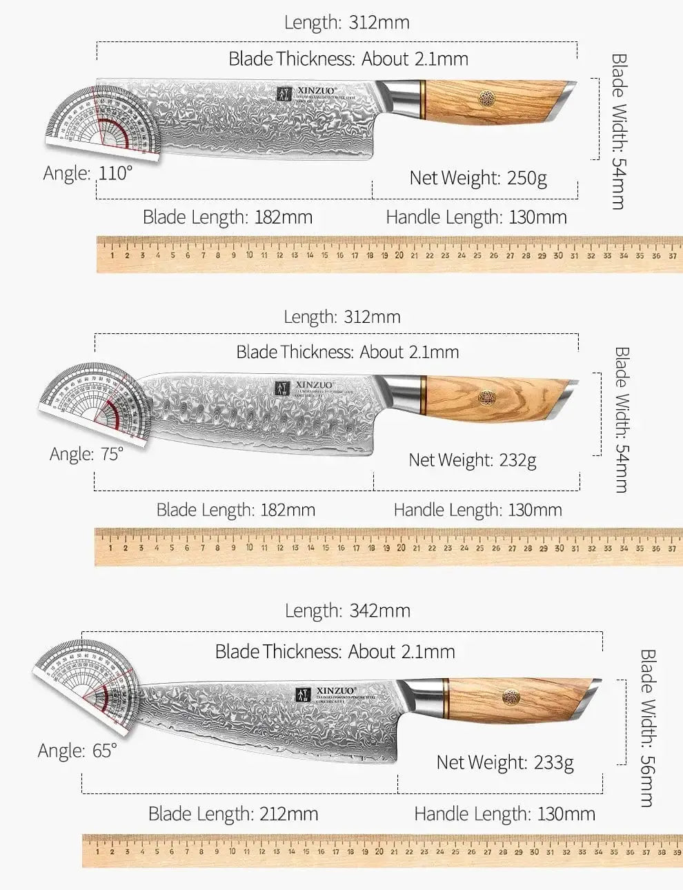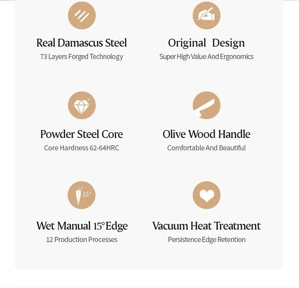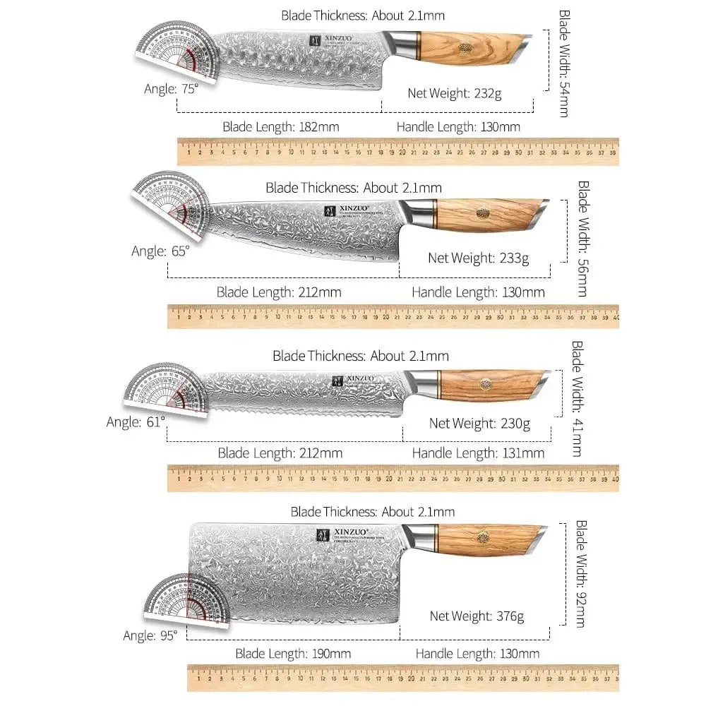 XINZUO 1-8pcs Kitchen Knife Set 73 Layers Custom Damascus Steel 15°±1 Per Side Steel Blade with Olive Wood Handle