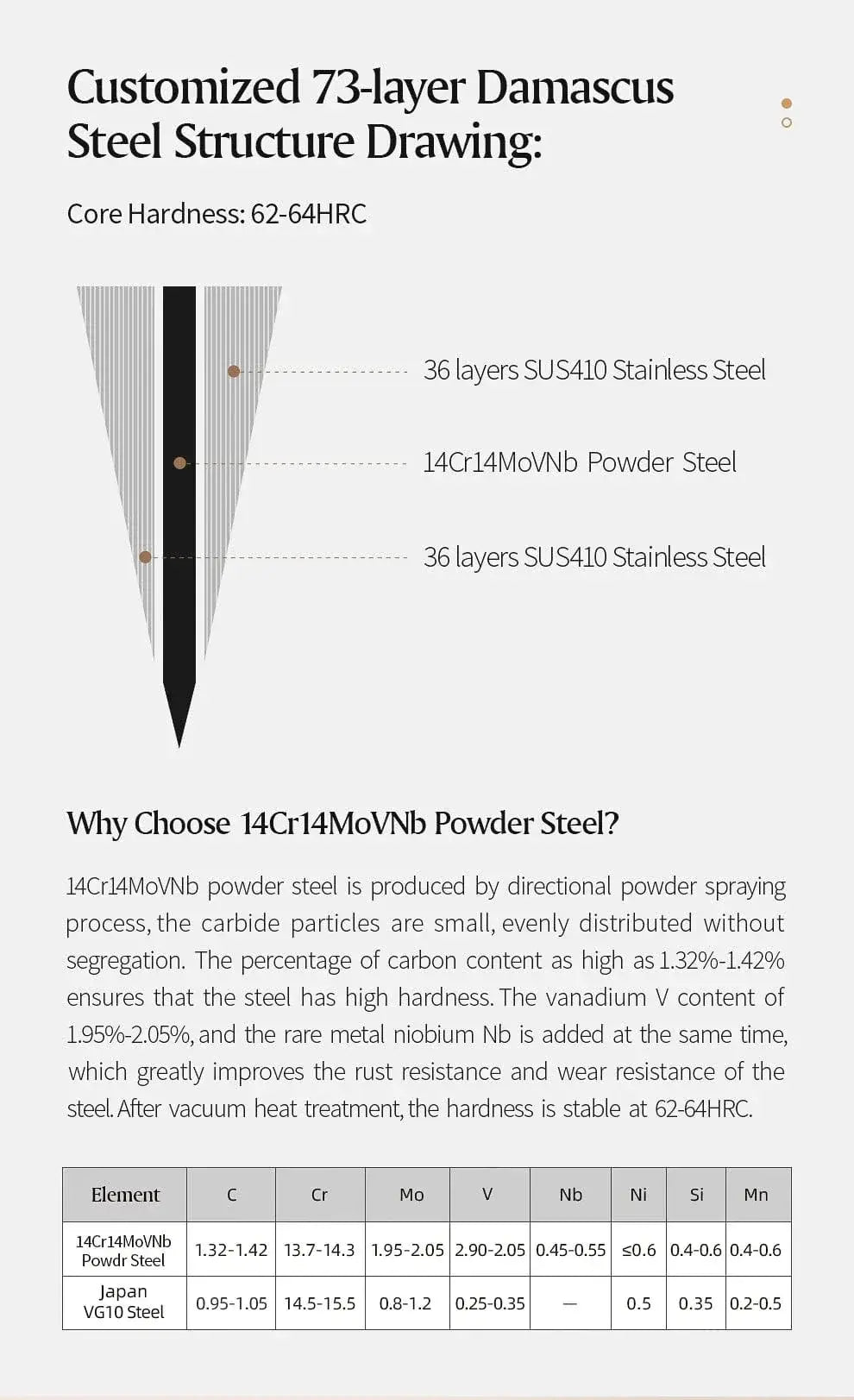 Blade Material: 73-layer powder steel core Damascus steel
