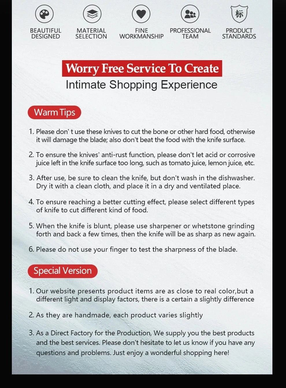 Blade Material:1.4116 Molybdenum vanadium steel of Germany ThyssenKrupp Ggroup