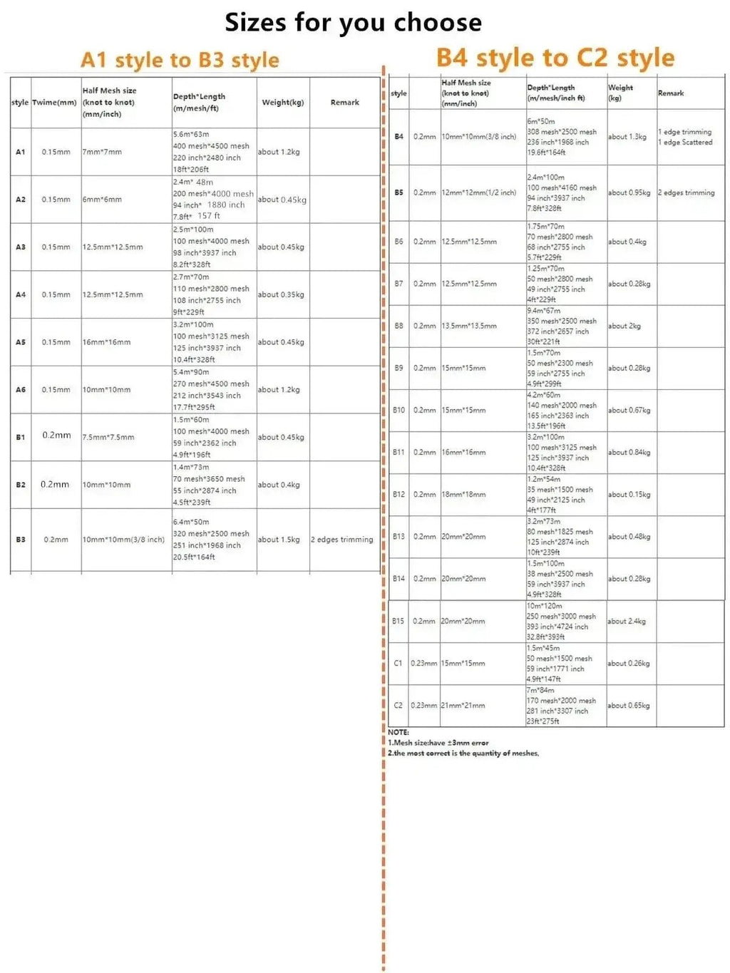 | B2 | 0.2mm | 10mm*10mm | 1.4m*73m 70 mesh*3650 mesh 55 inch*2874 inch 4.5ft*239ft |