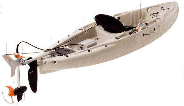 1. Mounting ball attaches to the top of the kayak. Ball-and-socket joint adapts to different kayak shapes. Only the small mounting ball is fixed permanently to the boat, the motor with all the other parts can be easily removed when not needed.